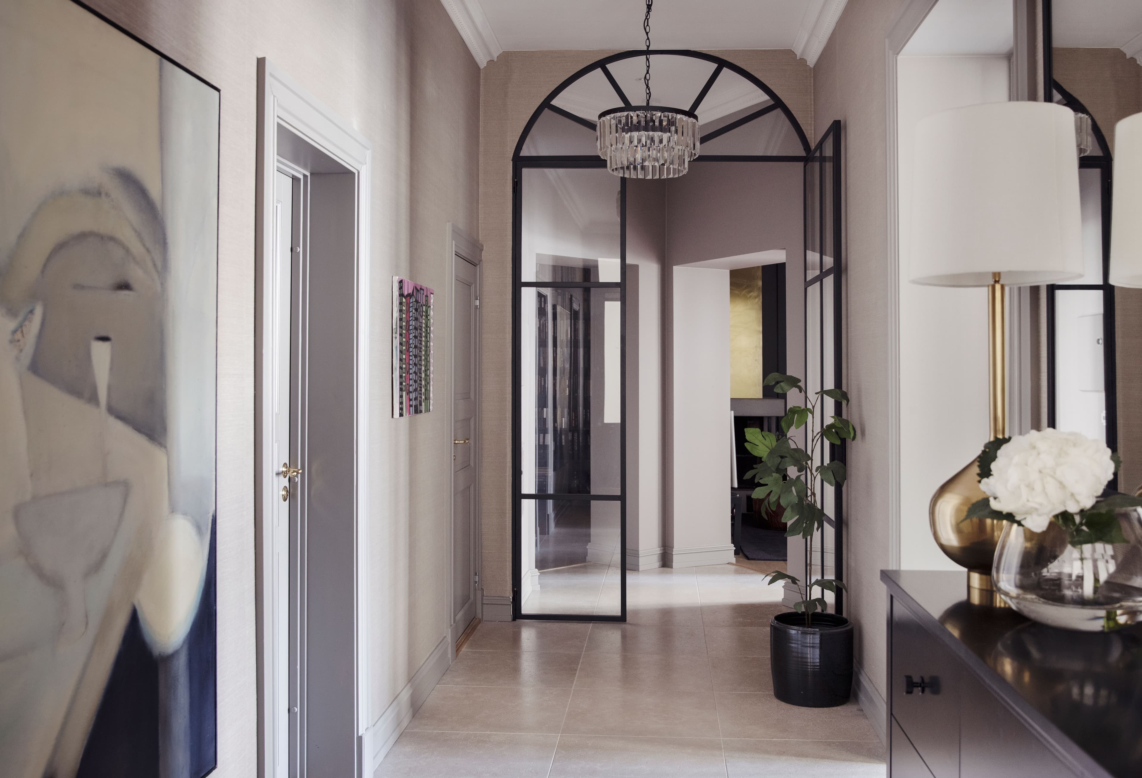 I denne majestetiske leiligheten på Frogner i Oslo ville kunden ha et spektakulært blikkfang i gangen. Svaret ble en stor glassdør med sorte stålrammer og et stilig, buet felt på toppen.