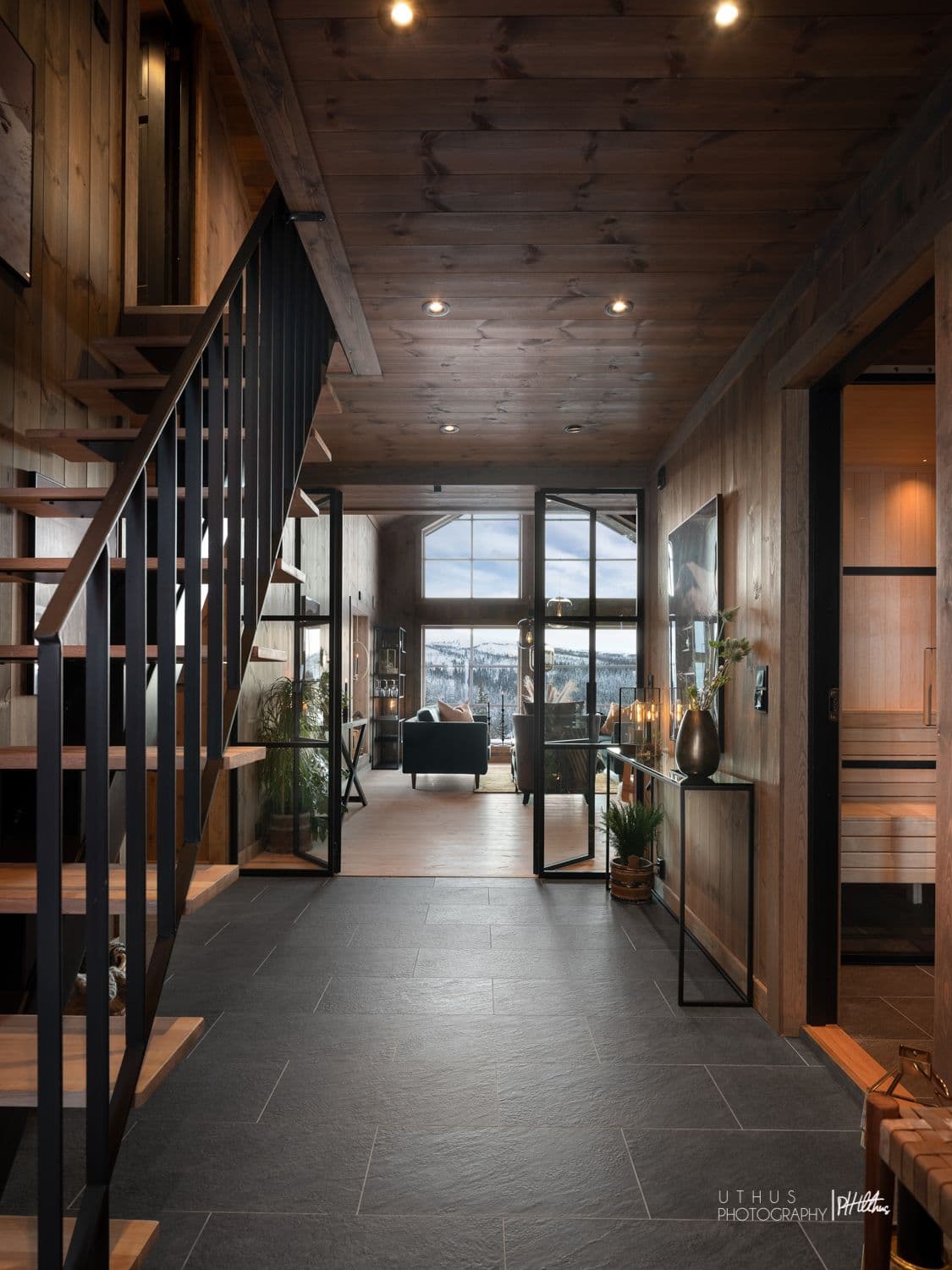 Fjellhytte fullspekket med unike løsninger fra Myhre Smie. Her laget vi blant annet en luftig ståltrapp med tilhørende rekkverk, badstuvegg og dusjdør i glass og jern, peisomramming, baderomsinnredninger, samt en smijernsvegg mellom stue og gang.